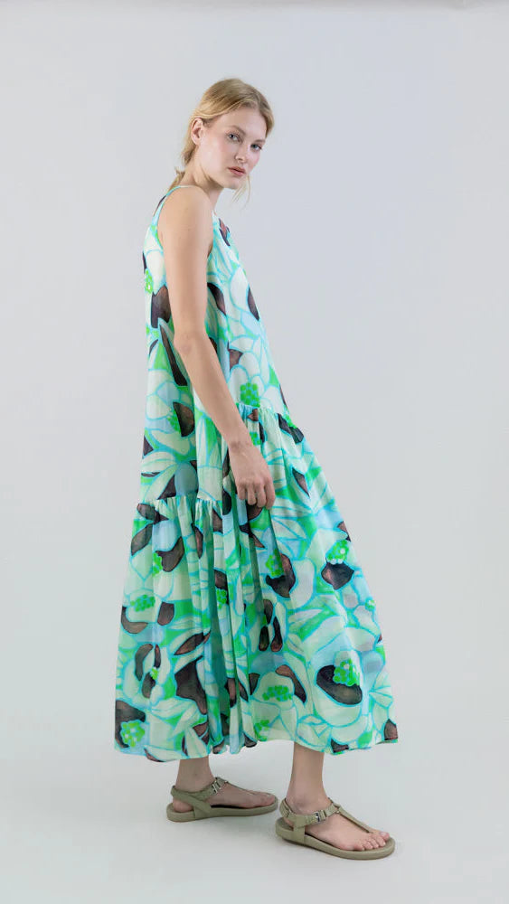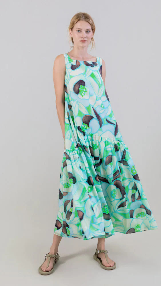 The collection's exclusive print , inspired by light filtering through leaves, combines pastel shades, soft greens, and cream hues that evoke serenity. Its organic and fluid shapes, outlined in turquoise, create depth, movement, and visual harmony, reinforcing the dress's artistic and contemporary character. An ideal piece for women seeking a feminine, modern look.