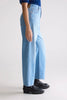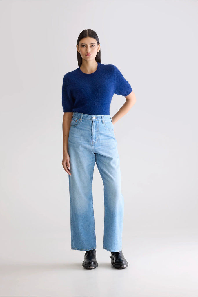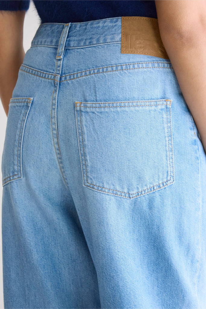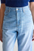 Hip-hugging, super high-rise jeans with wide legs made from vintage light blue cotton denim.