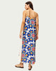 The back showcases a bold all-over floral pattern where blue blooms create a striking geometric arrangement. Delicate adjustable straps with decorative chain detail and flowing maxi silhouette with side slits offer effortless elegance.