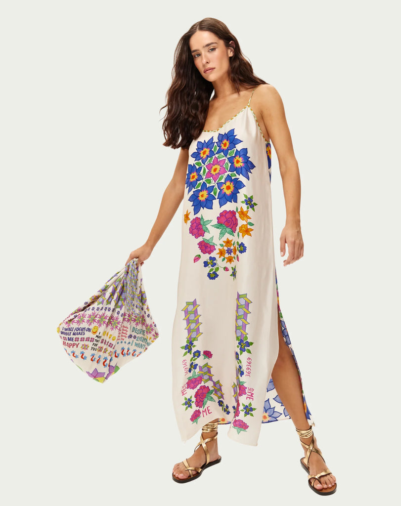Bloom with joy in the Olivia maxi dress from our Markers collection, featuring a stunning mandala of large hand-painted blue flowers with orange centers at the bodice. Pink roses, orange lilies, and colorful botanical motifs cascade down the cream base, while sharp geometric cube patterns in purple, lime, and turquoise line the sides.