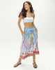 Vanessa midi skirt featuring all seven chakra symbols arranged vertically in vibrant rainbow colors. Turquoise vertical stripes at the top transition into soft pink and lilac hues adorned with mystical runic scripts and sacred geometry.
