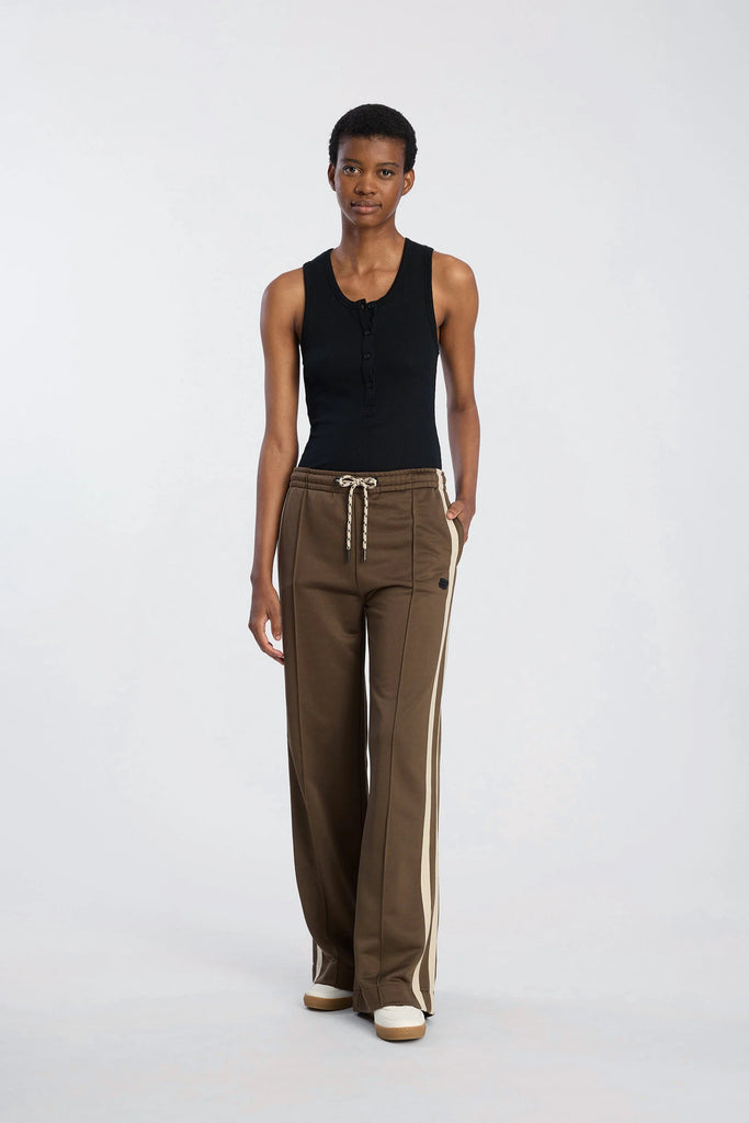 These trousers feature a straight, relaxed fit with an elastic waistband and adjustable drawstring. They are finished with bold side stripes, front creases, and a small embroidered logo. A sporty design suited for everyday wear or more styled looks.