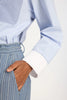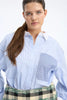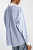 Striped shirt with contrasting white collar and a chest pocket and shoulder panels in a matching striped pattern. It features long sleeves with white cuffs, a concealed button closure, and has a loose fit.