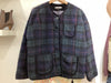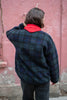 Fleece jacket in a navy all over check print with lines of rust throughout in a wonderful pattern. Three patch pockets on the front for practicality and the jacket features a button up front and black corduroy trimming on the edges.