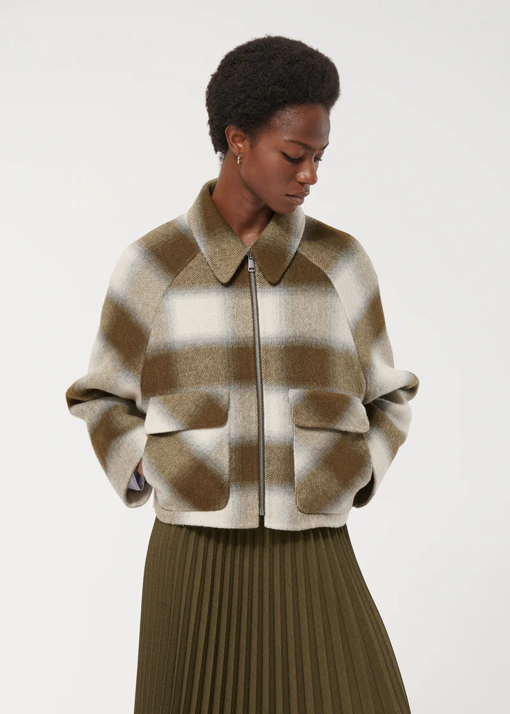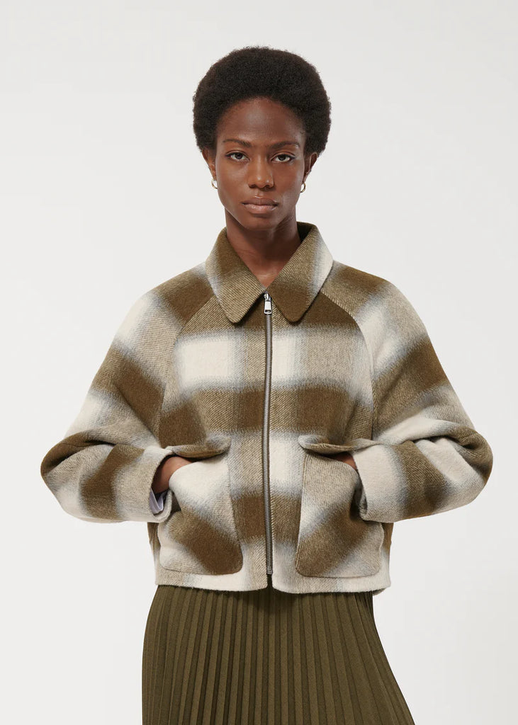 Short jacket with tie and dye check pattern in blended wool