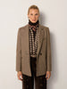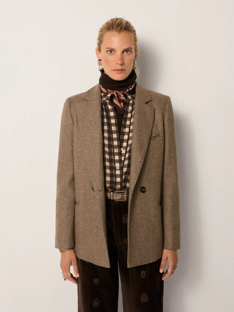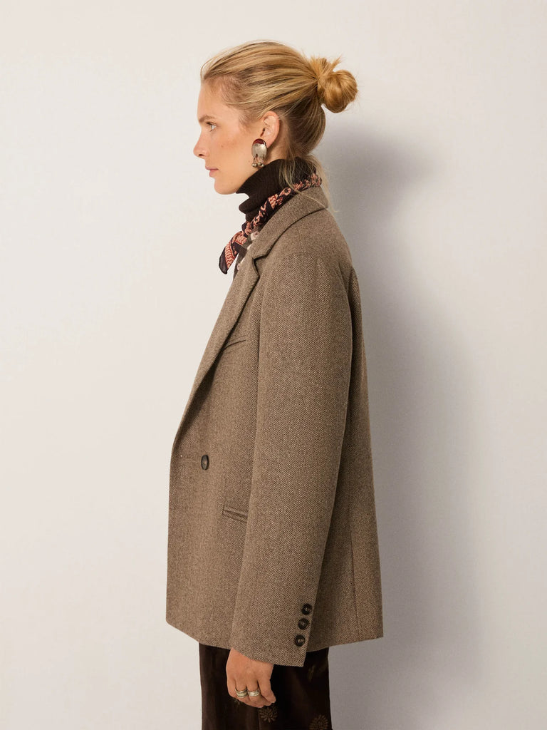 Herringbone wool blend creates depth and texture in a blazer that feels timeless. The earthy walnut tone grounds its structure.