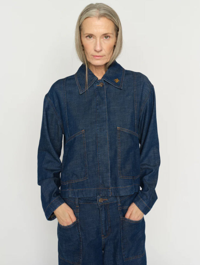 This denim-inspired jacket offers a refined take on casual dressing. Designed in a relaxed fit with a classic collar and button closure, it features clean lines and subtle stitching for a modern finish. Perfect for layering over dresses, knits, or tailored pants for effortless versatility.