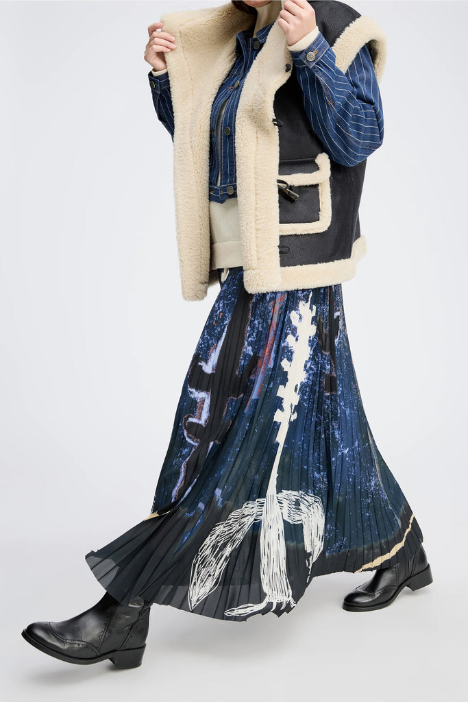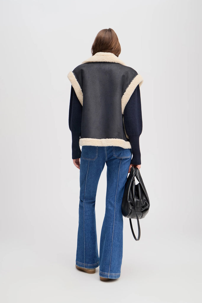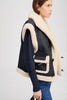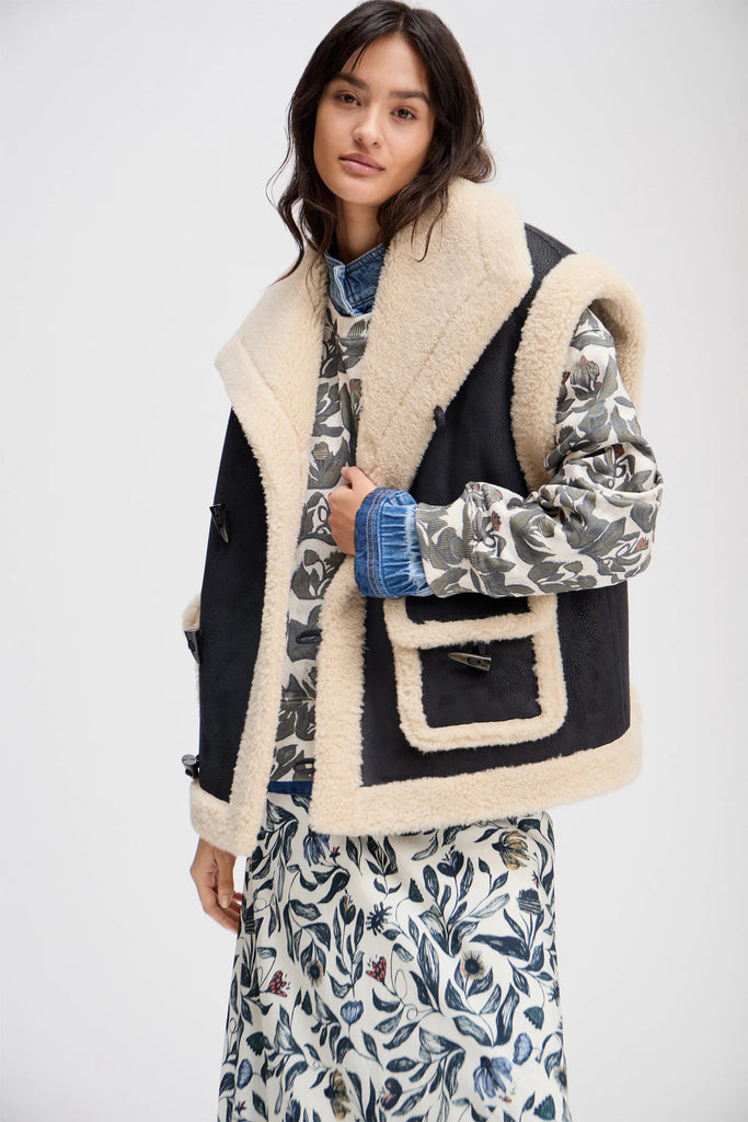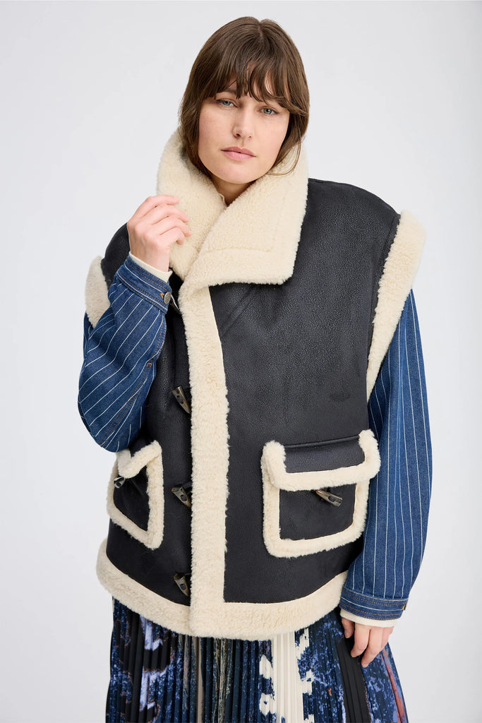 An elegant vest made of animal-free leather, designed with a toggle closure and beautiful faux horn buttons. The vest is designed with oversized pockets.