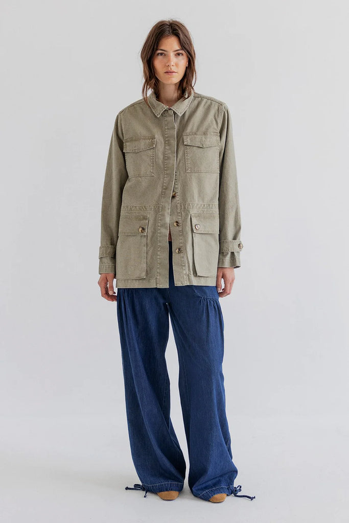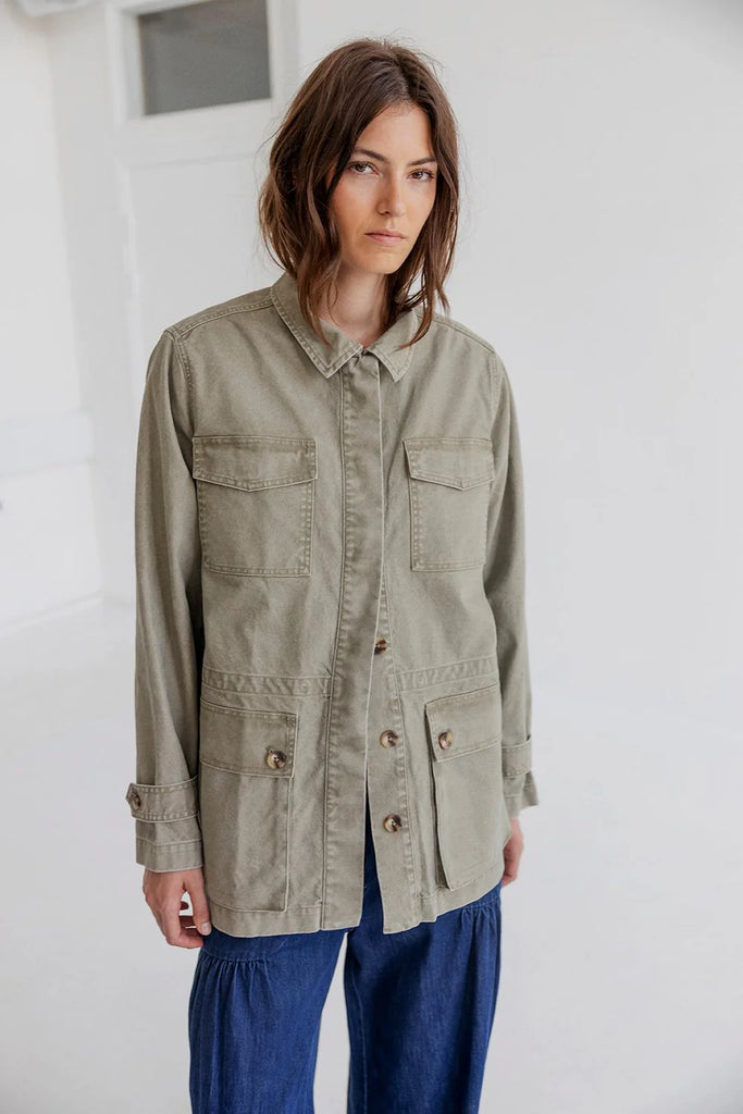 BARKER is a utility-inspired jacket in structured cotton canvas with a workwear look and refined finish. Designed with four front patch pockets, adjustable cuff straps and hidden button closure all the way down. Inside, an adjustable drawstring allows you to cinch the waist from within. The washed cotton canvas adds weight and structure while remaining soft to the touch.