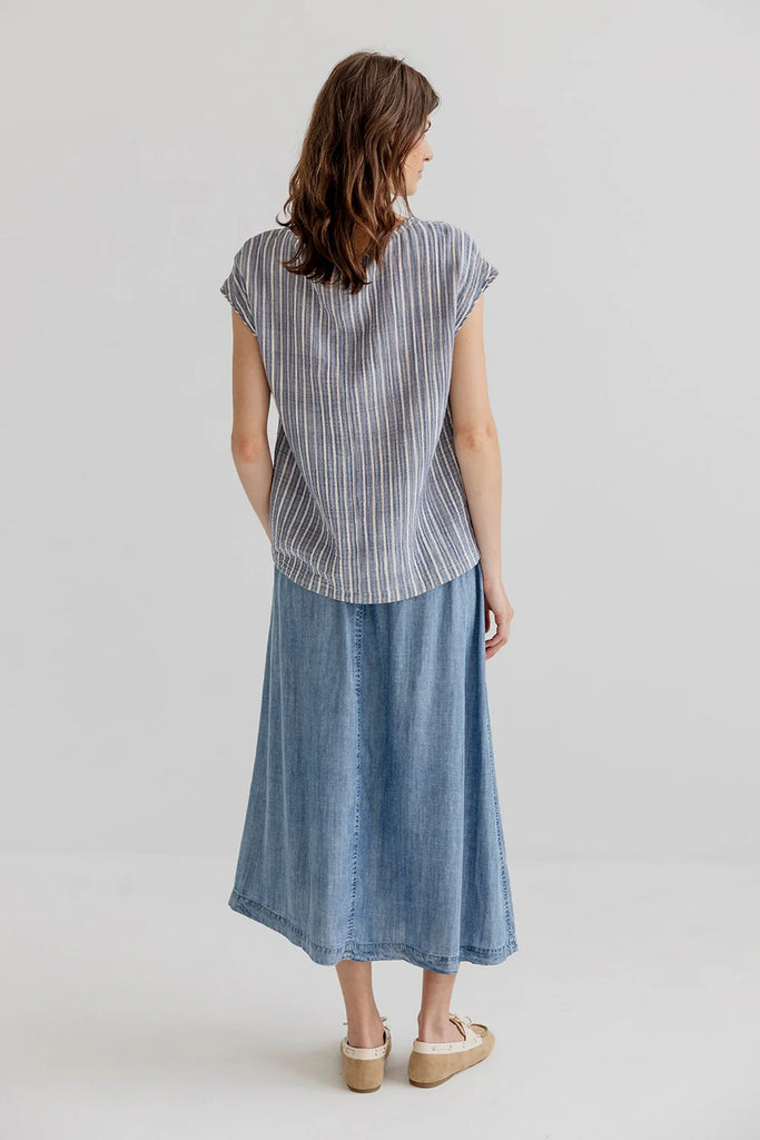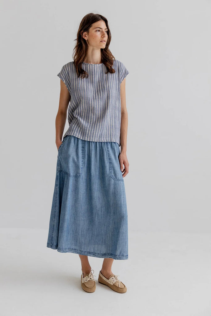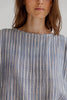 MADDEN is a waffle cotton shirt with a round neckline and sleeveless silhouette. Designed with relaxed fit that works easily on its own or layered. The shirt is a bit longer at the back than at front. The fabric is sourced from Italy and features stripes on one side and checks on the other side. The shirt is not reversible but both options are available. The very fine yarn gives the fabric a soft texture and a light, comfortable feel. Can be paired with the matching Maggie skirt or Mea Pants.
