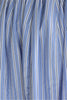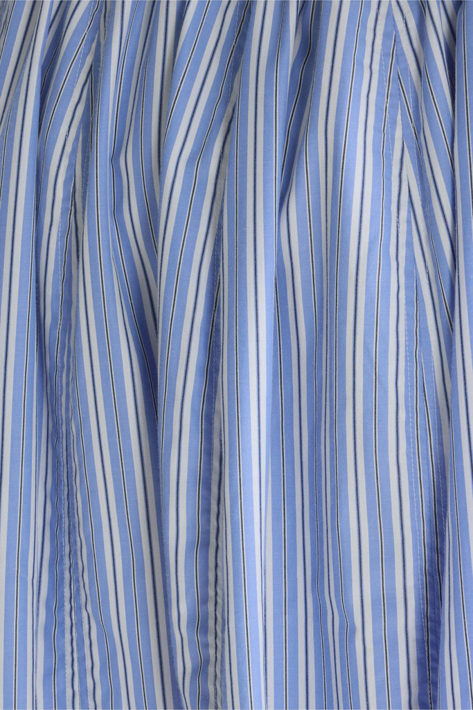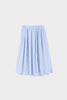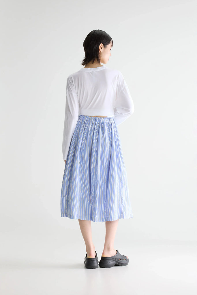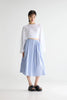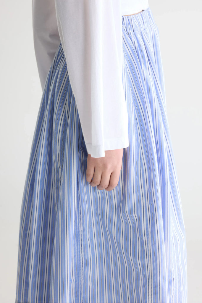 Blue gathered midi skirt with fine black and white vertical stripes, side seam pockets, and an elasticated waistband.