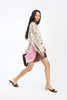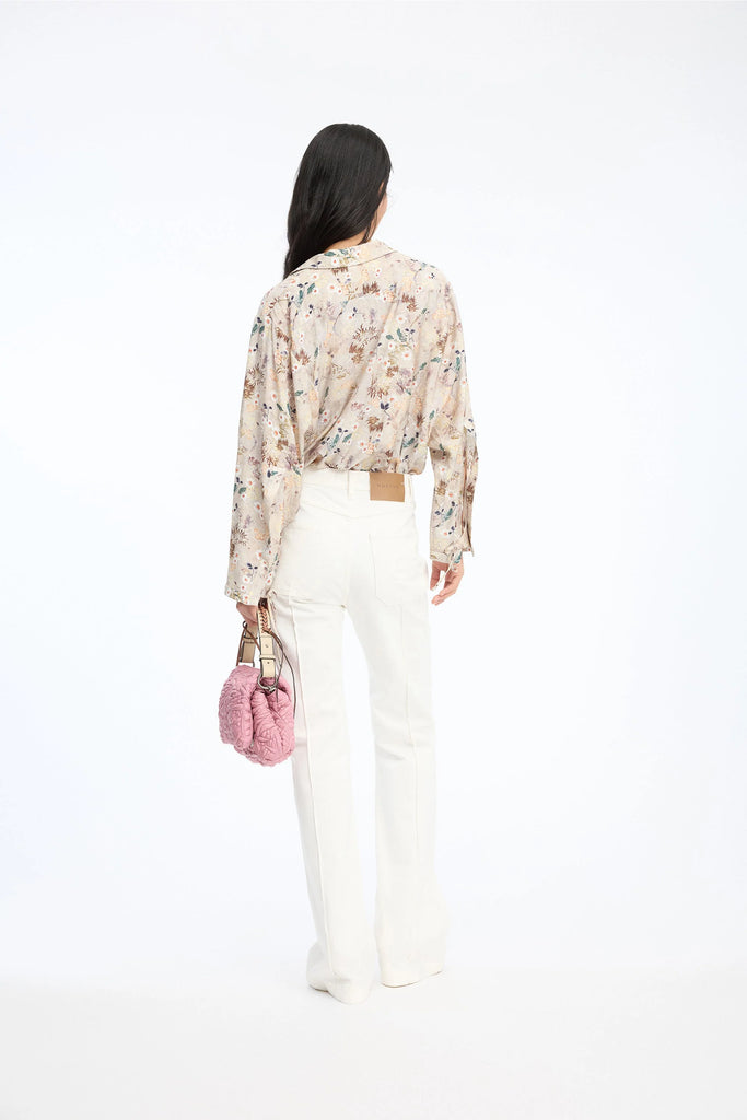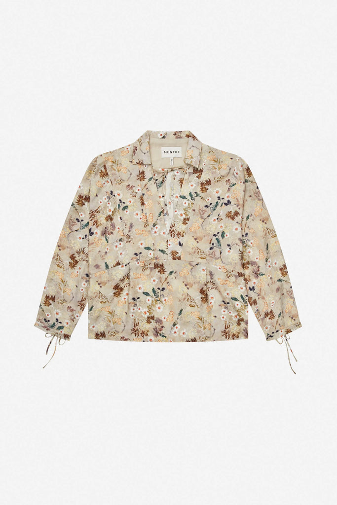 Top in a light fabric featuring a nature-inspired print. The silhouette is loose, with adjustable drawstrings at the sleeves.