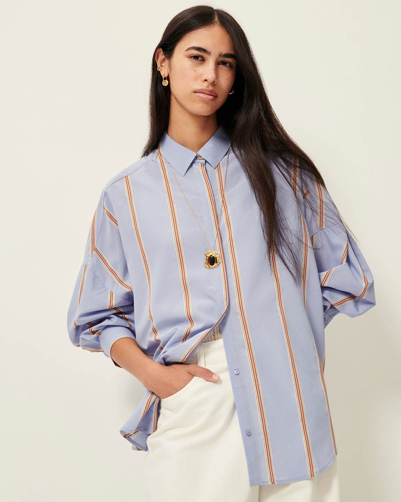 Loose-fitting shirt with pleated dropped shoulders, made from a Sessùn-exclusive viscose linen with contrasting stripes, woven in Italy.