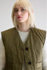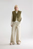Relaxed reversible sleeveless jacket with leopard faux fur on one side and quilted khaki wavy fabric on the other.
