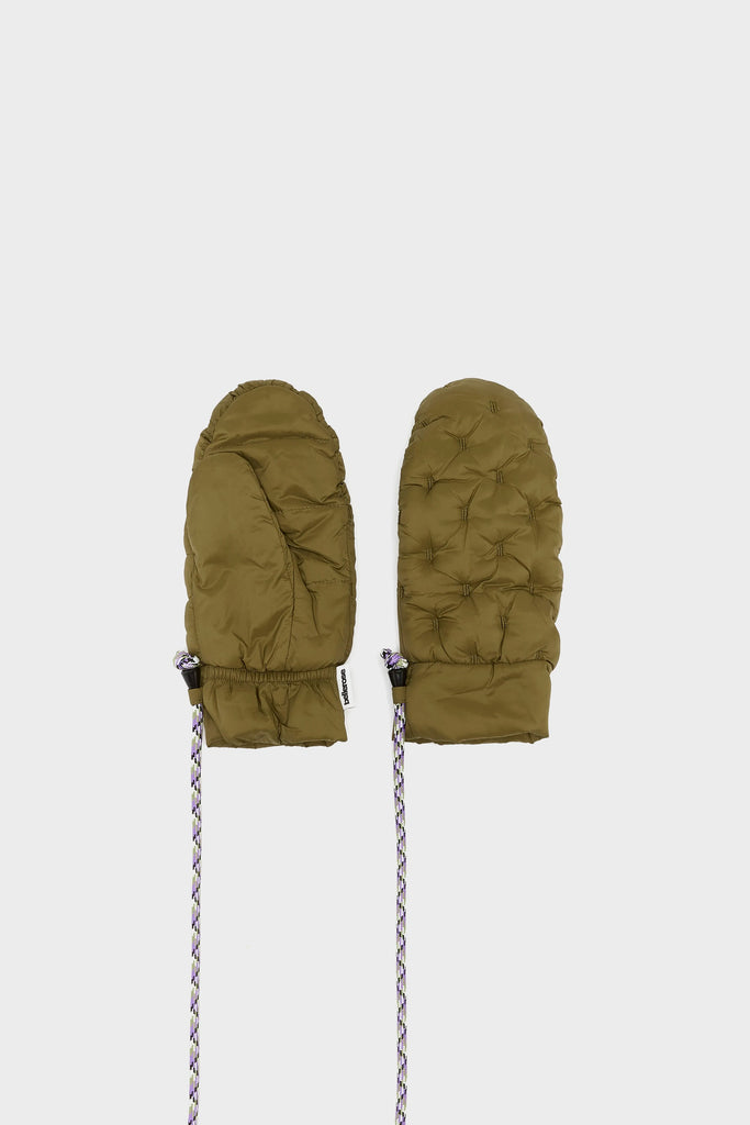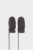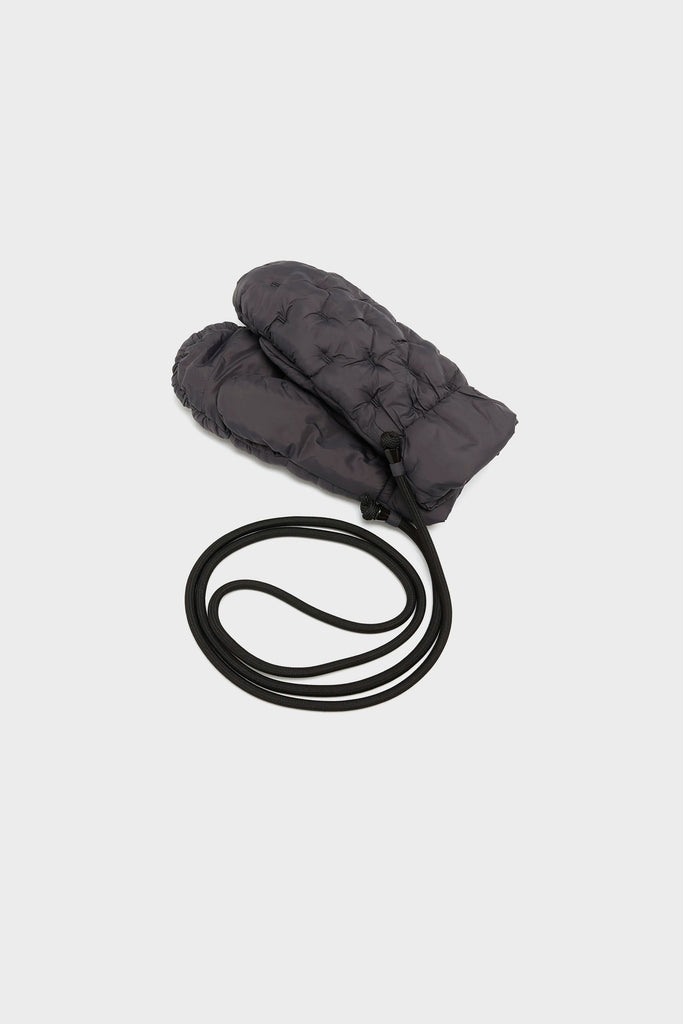 Padded mittens in dark grey nylon with a quilted finish, completed with a matching black cord attachment.