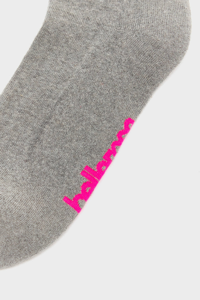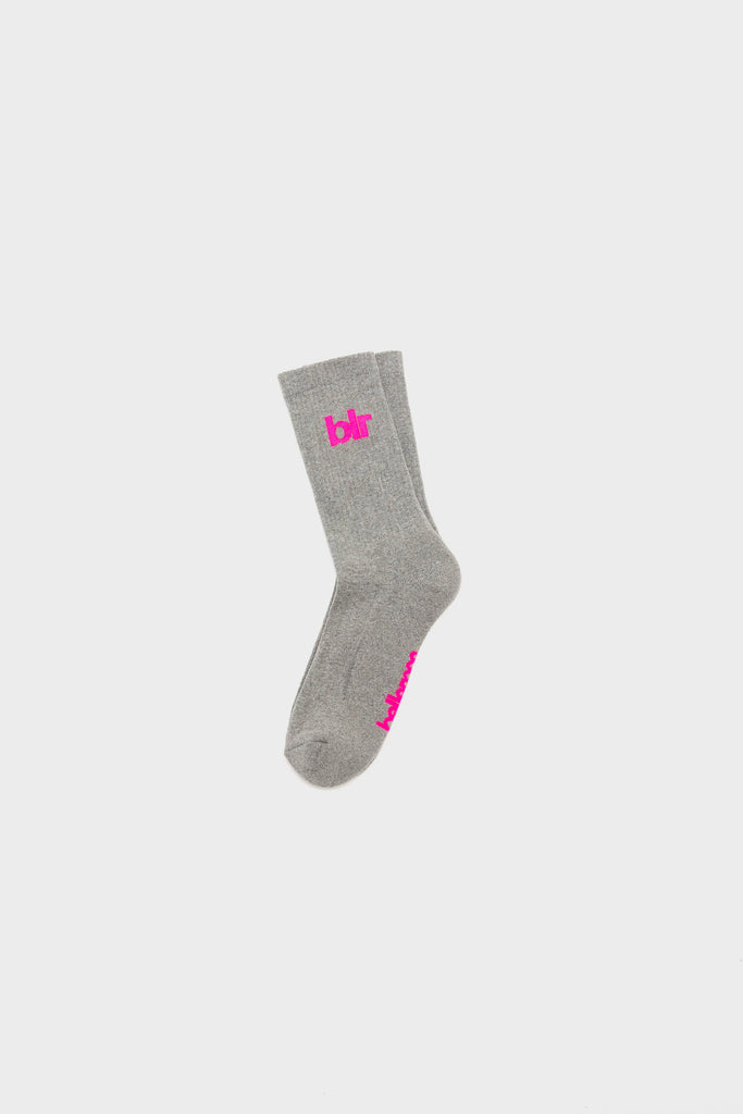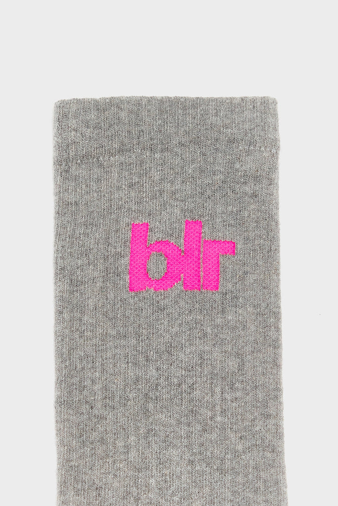 Ribbed crew socks in mid grey with a pink blr logo on the ankle and a pink bellerose logo on the sole, featuring reinforced toes and heels for extra comfort.