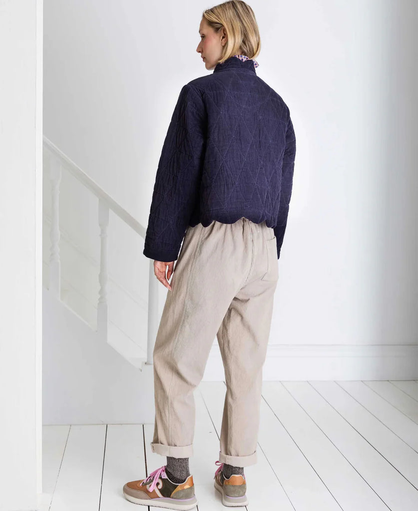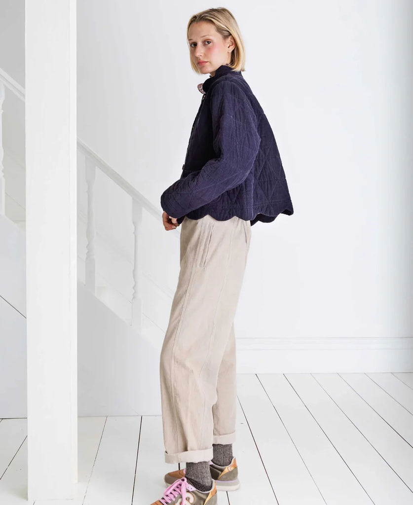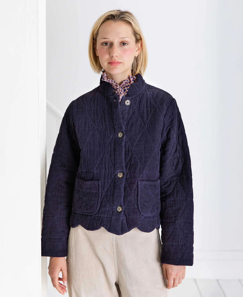 The Dillis Jacket by Bronte is a modern take on utility styling with a soft, feminine edge. Crafted from a quilted organic cotton mix, it features a slightly cropped fit with delicate scallop detailing at the neck and hem. Layer over a crisp white shirt and jeans for effortless everyday elegance.