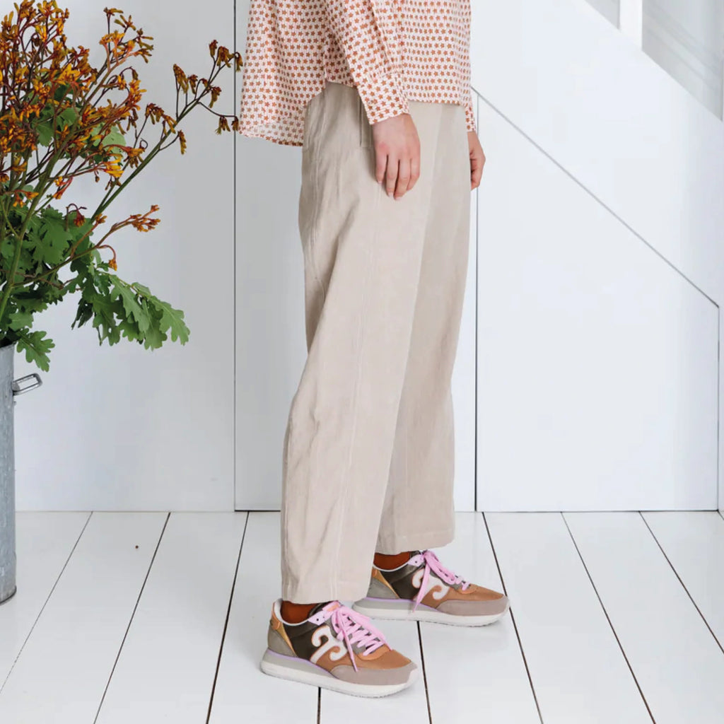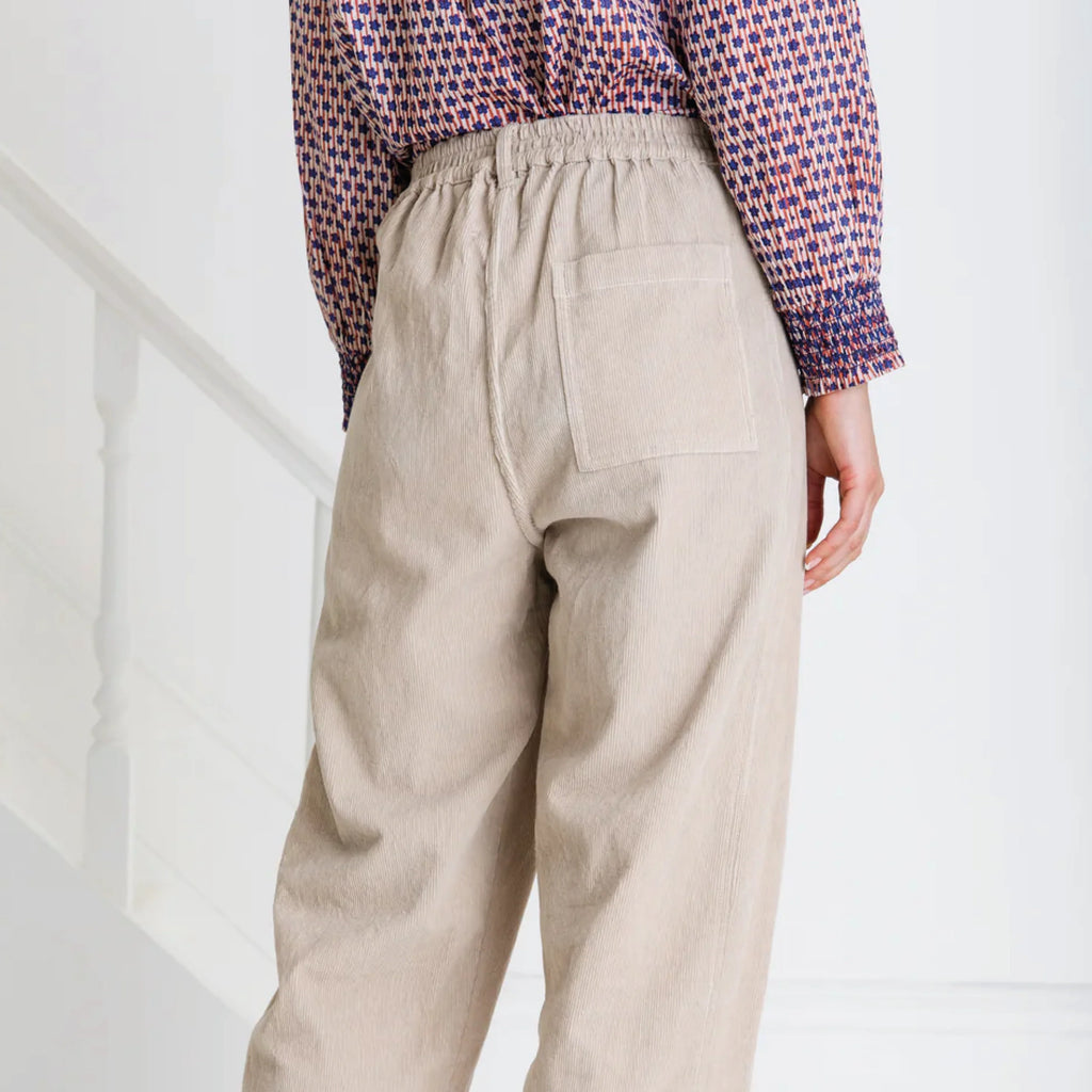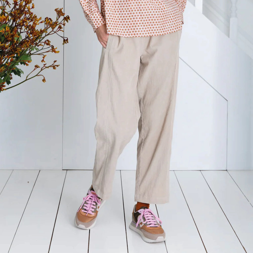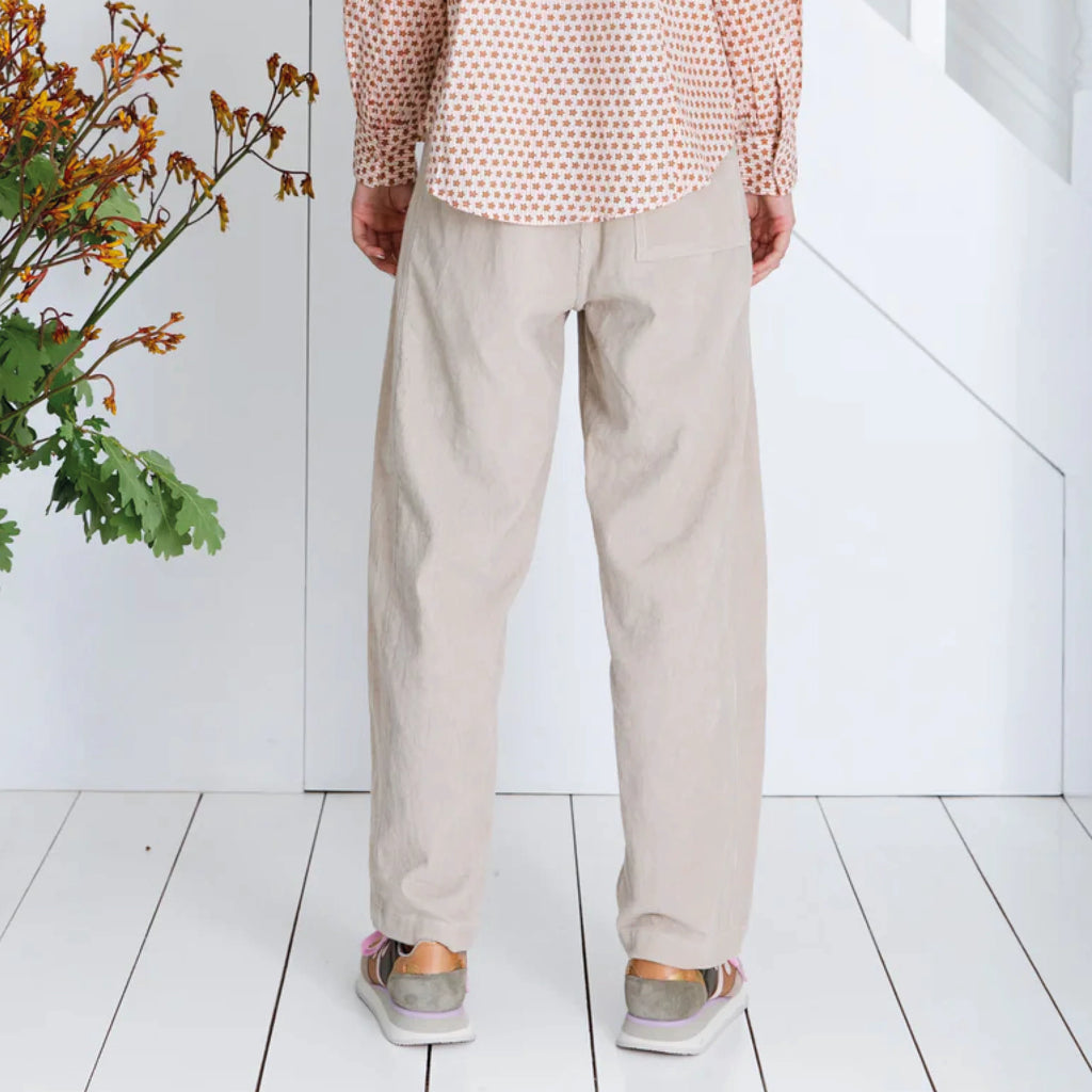 The barrel leg Bonté Ecru Cord Nova Trousers are a relaxed pull-on with an elasticated back, in an organic cotton baby-cord in a versatile ecru, with twin-needle detail. There is a side-seam panel detail with a welt pocket and one back patch pocket. This style work well both rolled up or down
