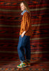 Our barrel leg jean is a relaxed pull-on with an elasticated back, in an organic cotton denim in a dark wash, with contrast twin-needle detail in tan. There is a side-seam panel detail with a welt pocket and one back patch pocket. This style work well both rolled up or down.