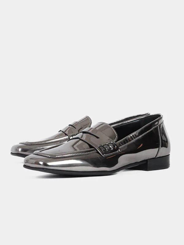 Elevate your style with the Marmo Silver Loafers from Bukela. Featuring a polished metallic sheen and a traditional penny loafer design, these shoes offer a seamless combination of daring flair and enduring elegance. Perfectly suited for any occasion, they add a statement to your everyday look.