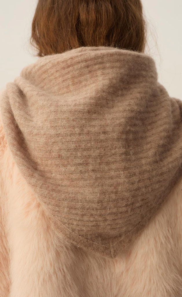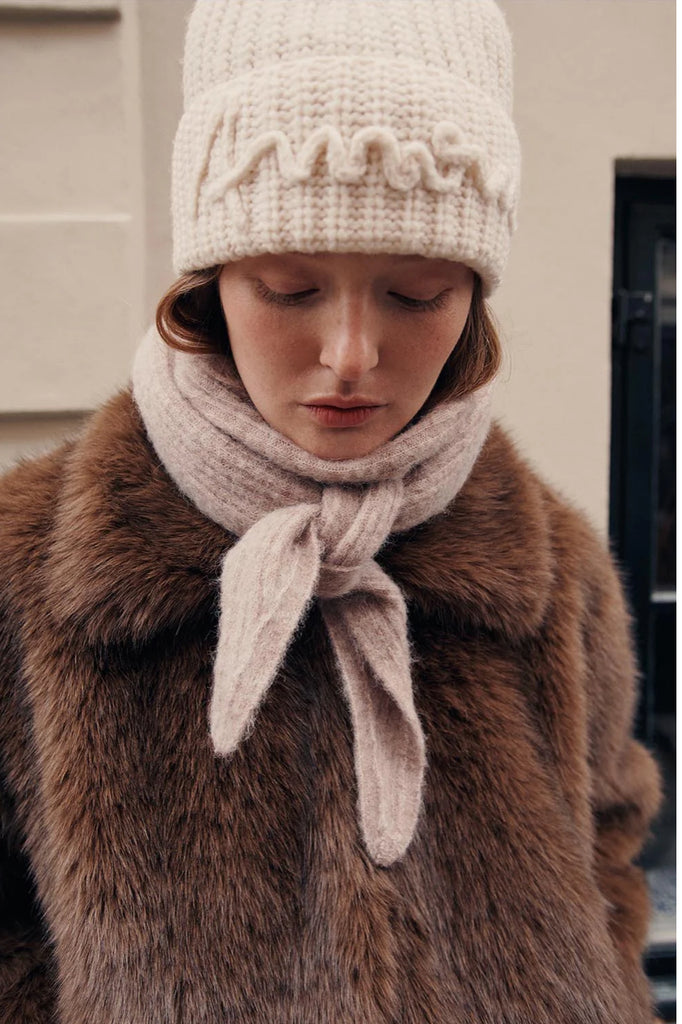 • Merino wool and alpaca triangle scarf • Necktie shape • Ribbed knit • Made from a blend of merino wool and alpaca that combines softness with warmth. Certified mulesing-free wool. • Loup colour: a timeless beige