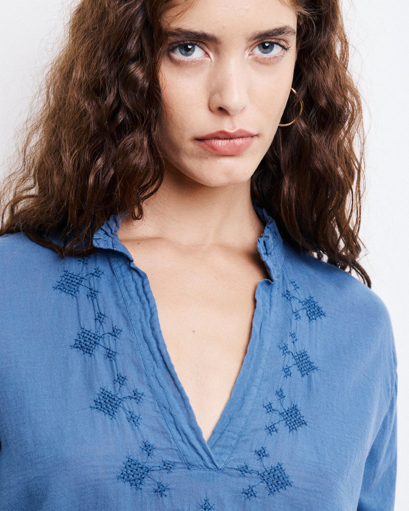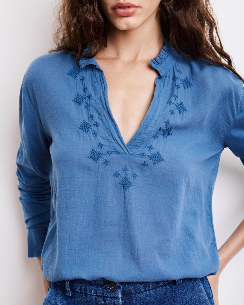 Long-sleeved women's top with open ruffle collar. Embroidery details on front.