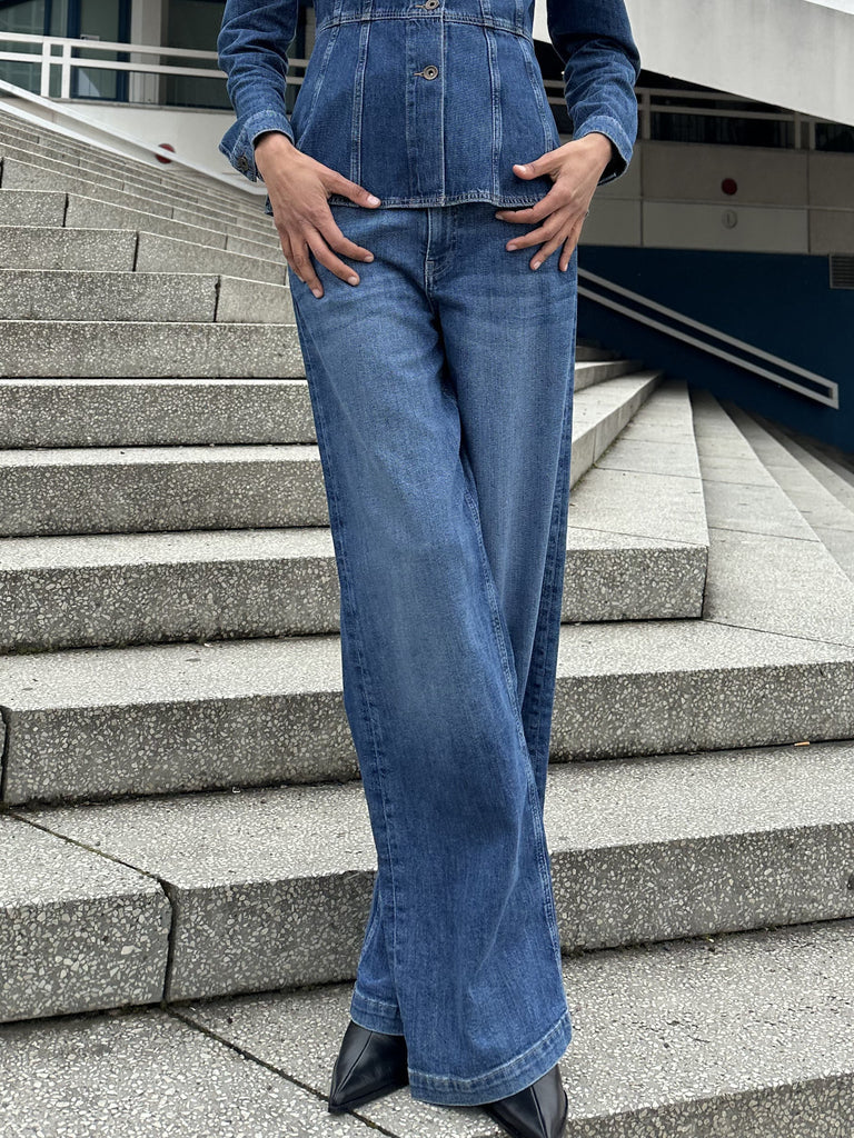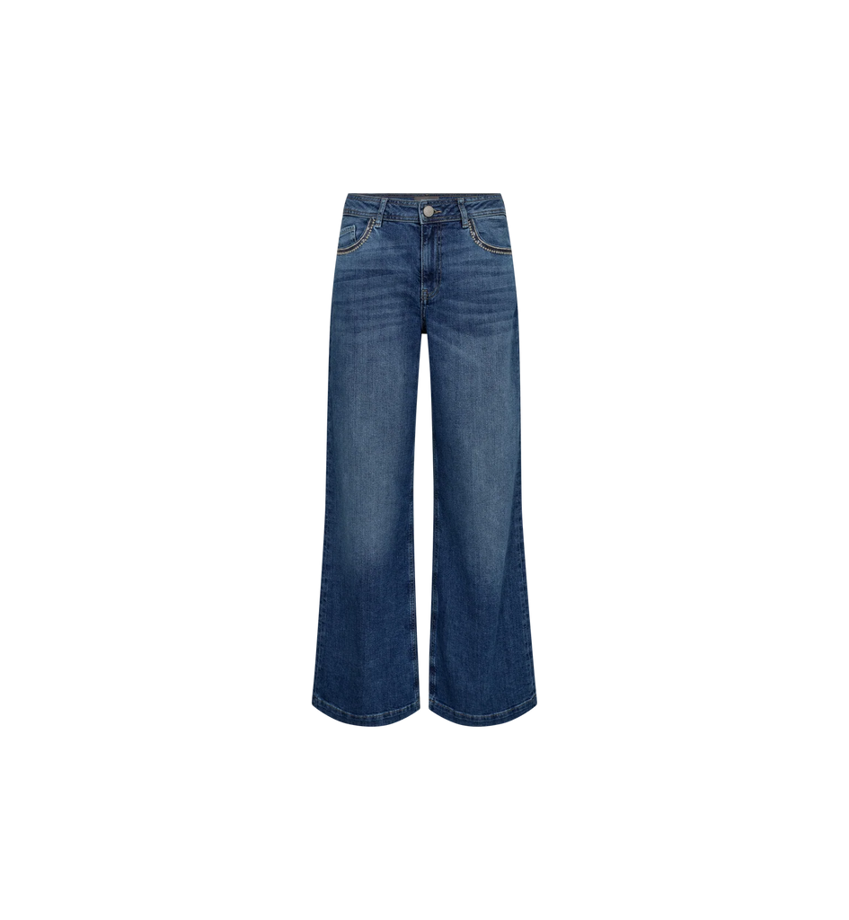 These versatile jeans are a year-round staple, designed with a flattering high-rise and effortlessly chic wide-leg silhouette. The front pockets are adorned with elegant lurex and stitch details, adding a subtle yet stylish touch. Style them with a cosy knit for a casual look or a flowy feminine blouse for a more polished outfit.
