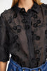 A beautiful shirt with delicate floral appliqués. The shirt features a button closure, semi-short sleeves that stop approximately below the elbow, and is designed with a slight puff.