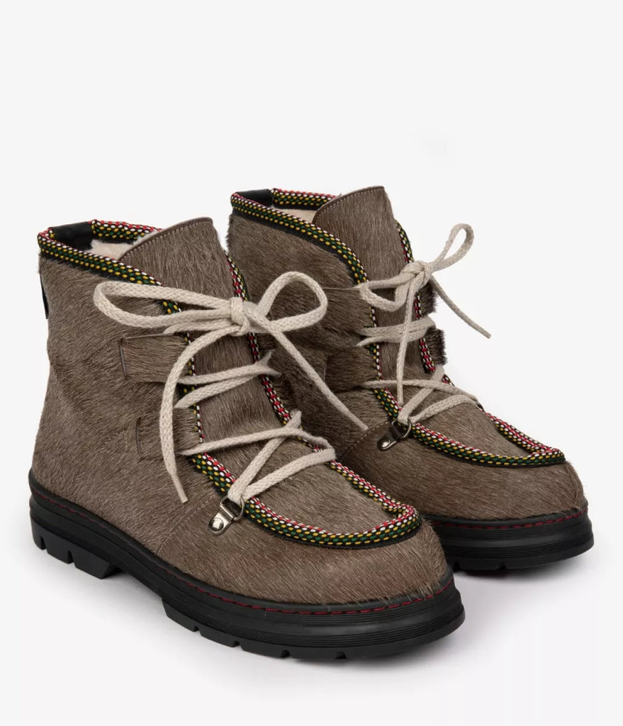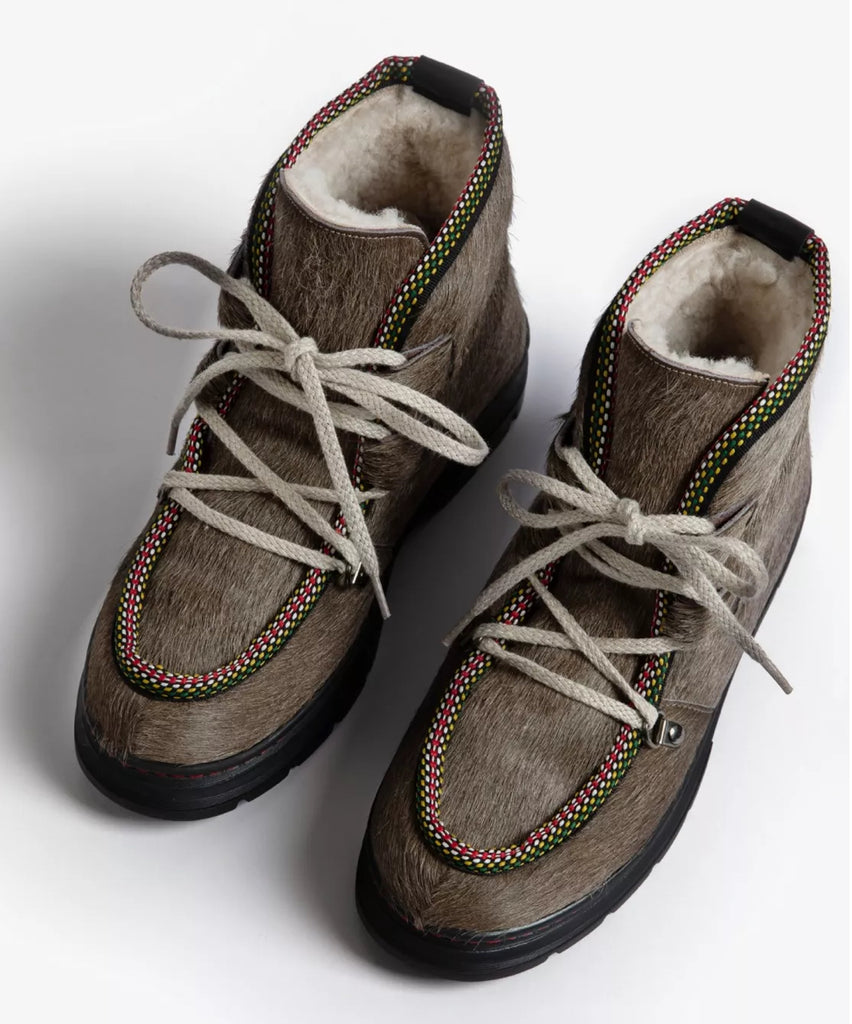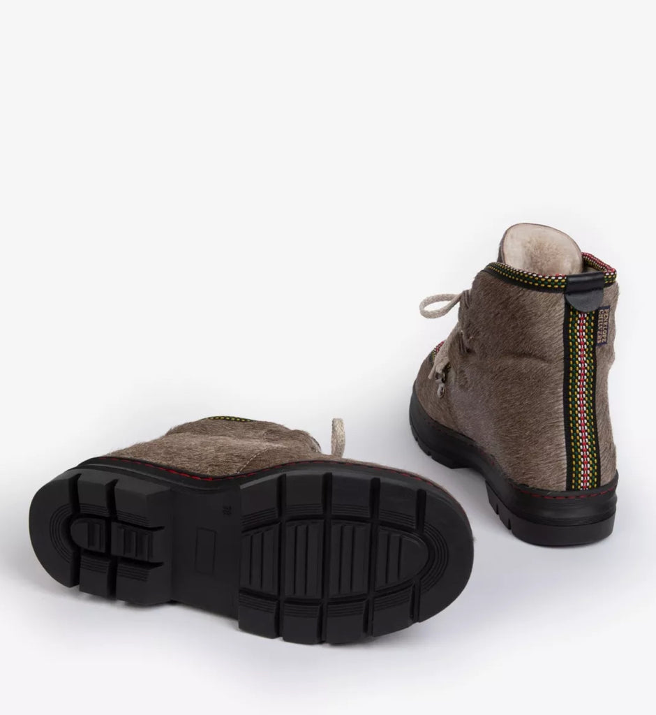 Italian pony skin (cowhide) upper with exclusive woven braid trim. Shearling lined with felted wool insoles and non-slip rubber soles. Made in Spain.