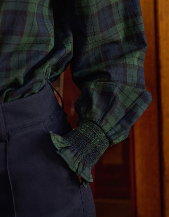Tonia - Straight check blouse with high collar and smocked detail - Blue and green