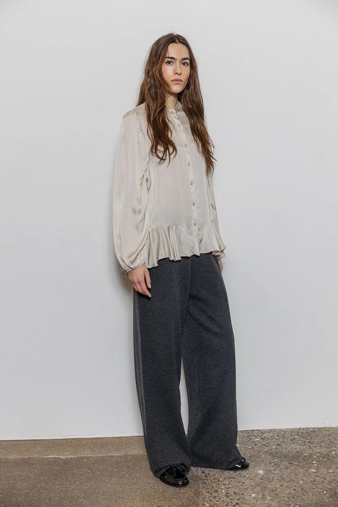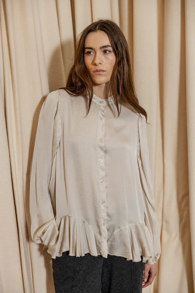 Designed with a gathered peplum hem and flared sleeves finished with elasticated cuffs. The fabric is an Italian viscose-silk blend, garment dyed using a special technique that softens the texture and gives the shirt a relaxed, washed look.
