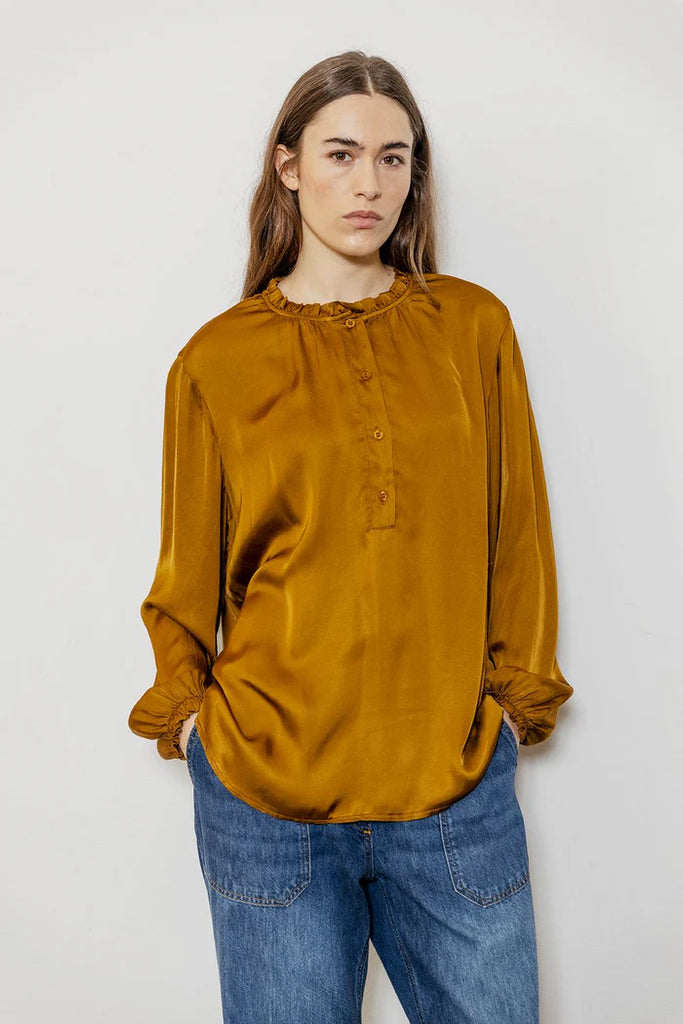 Crafted in a viscose-silk blend from Italy and garment dyed for a gently faded texture. Features a front placket, rounded hem and small frills created by elastic around the neckline and cuffs. A timeless piece for every season.