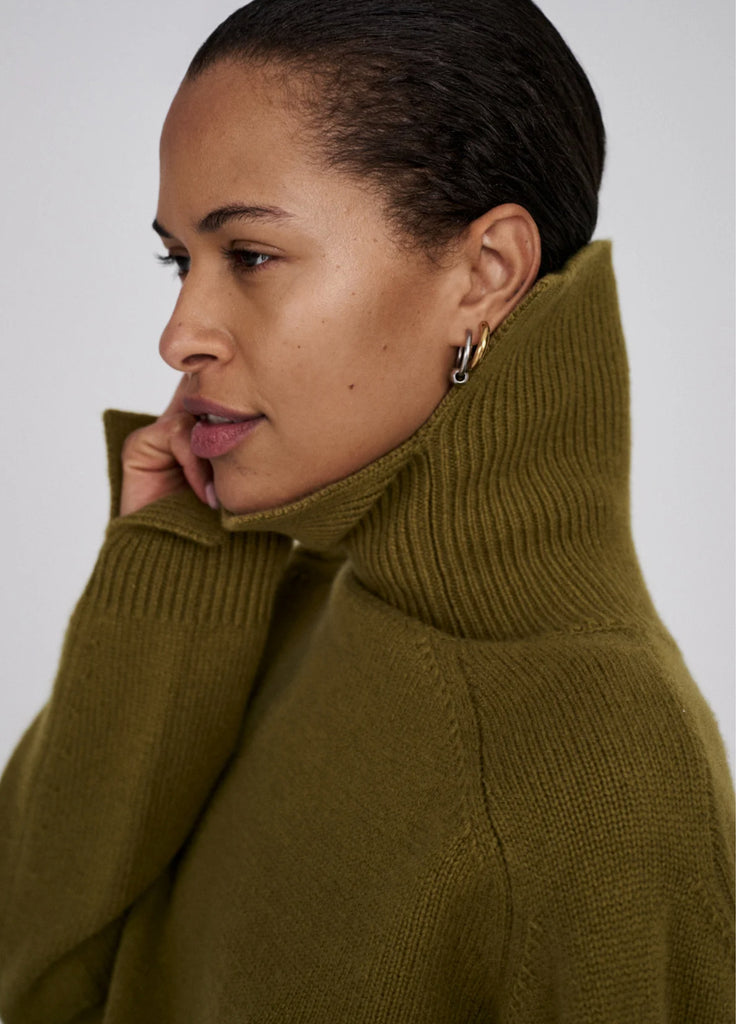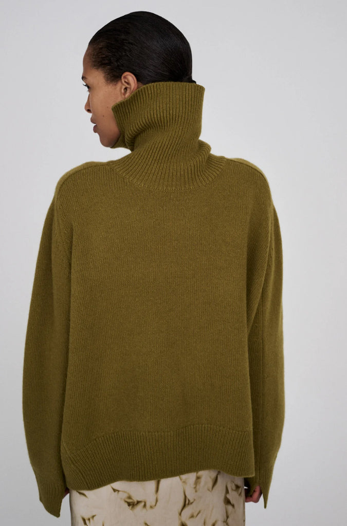 Crafted from a soft wool, the knitted roll neck is defined by a relaxed shape with a turtleneck with a slit in the back and long sleeves with ribbed edges and slits.
