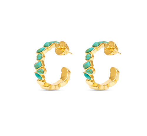 Featuring a deconstructed design with various hand-polished turquoise stones, each elegantly set within a thin gold frame, these hoops deliver the ultimate WOW factor. Perfect for injecting a touch of colour into your daily jewellery.