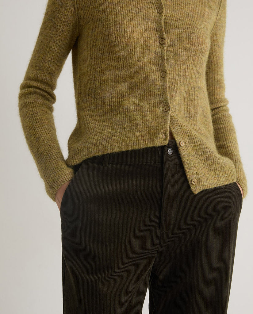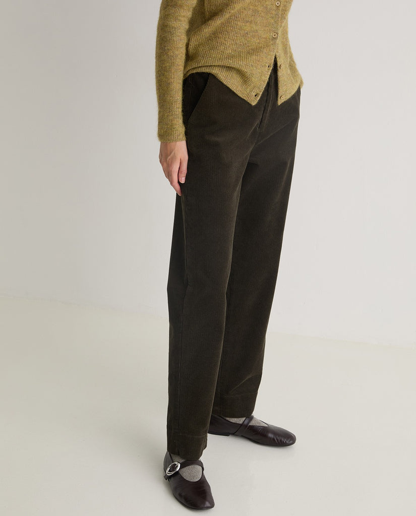 Corduroy trousers. Made of 100% cotton. Regular fit. Zip and button fastening. Elastic waist in back. Belt loops at waist. Two side pockets and 2 back welt pockets.