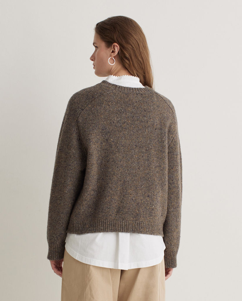 Knit sweater. Made of merino wool and recycled fibres. Mottled. Regular fit. Round neckline. Long raglan sleeves. Ribbed accents.
